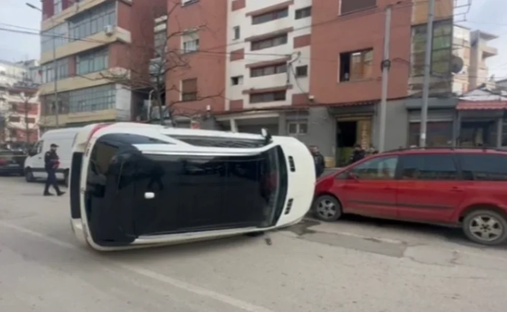 ku një automjet tip “Benz” është përplasur me një mjet të parkuar dhe më pas është përmbysur në mes të rrugës.