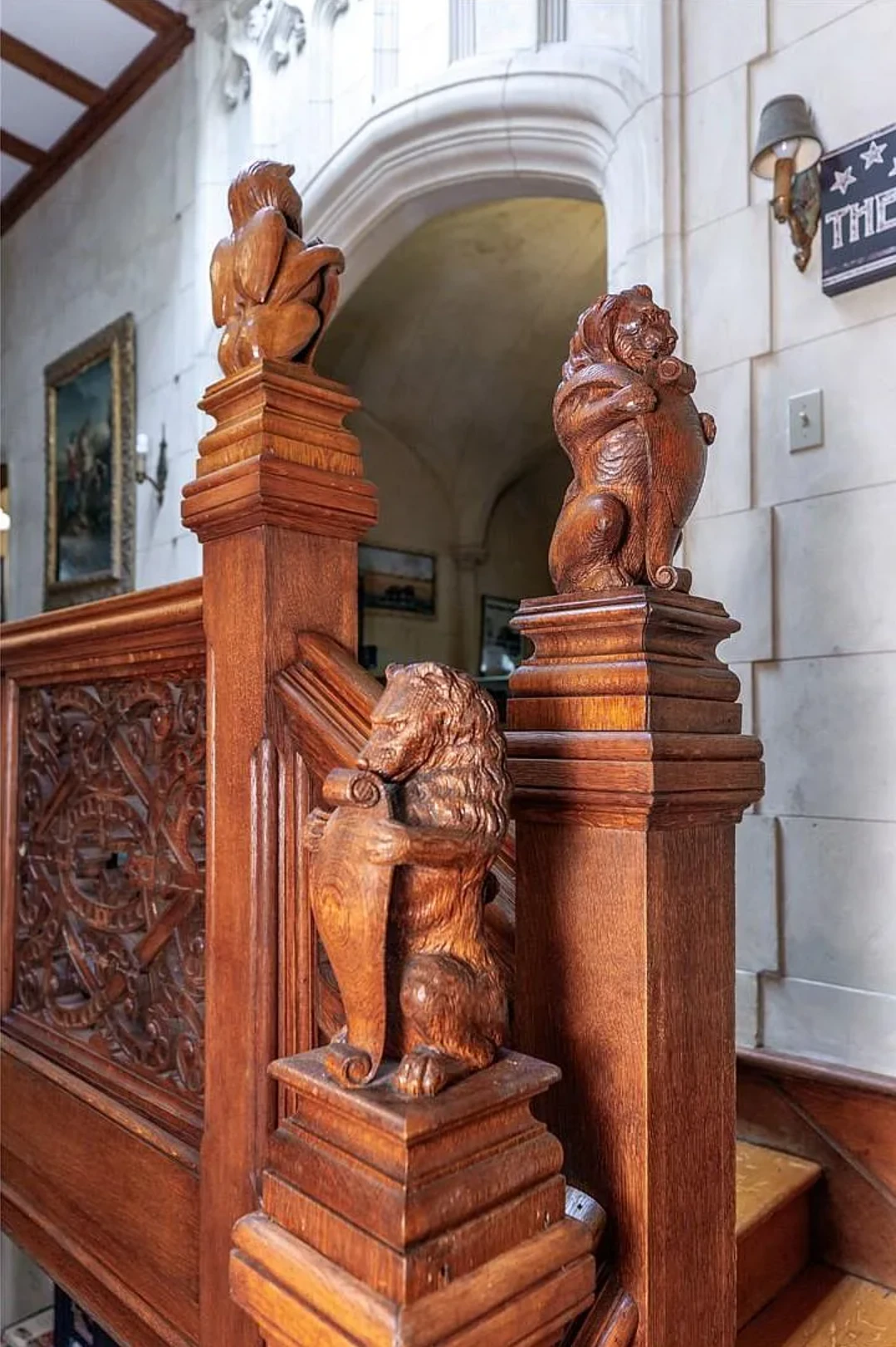 Figured-Oak Grand Staircase with Carved Animals ,