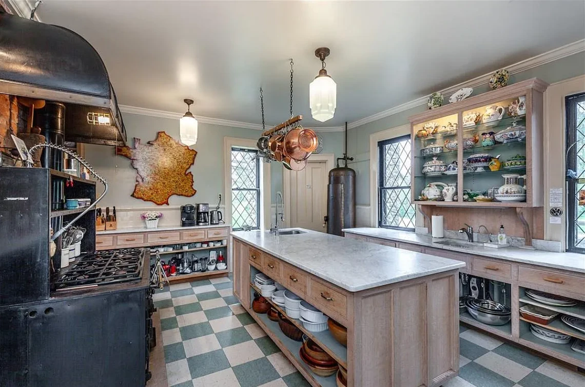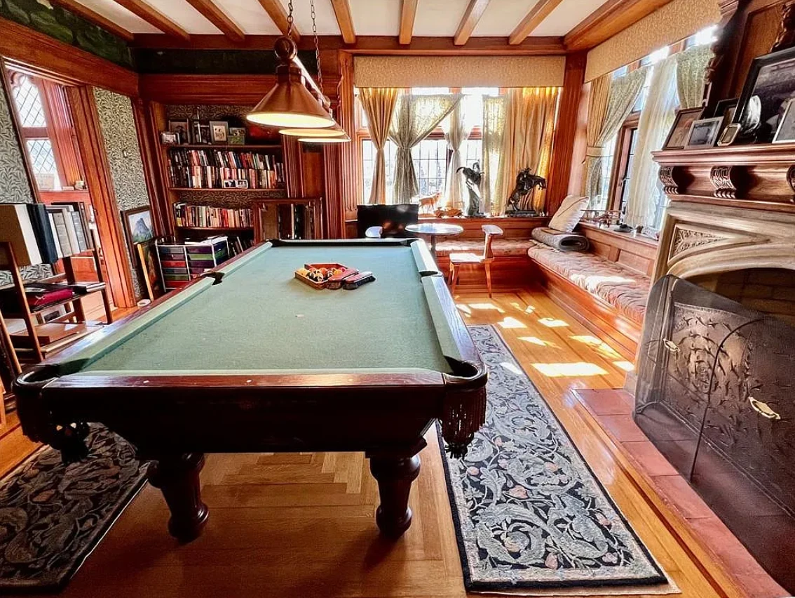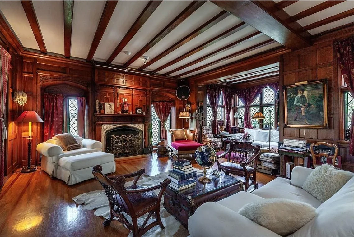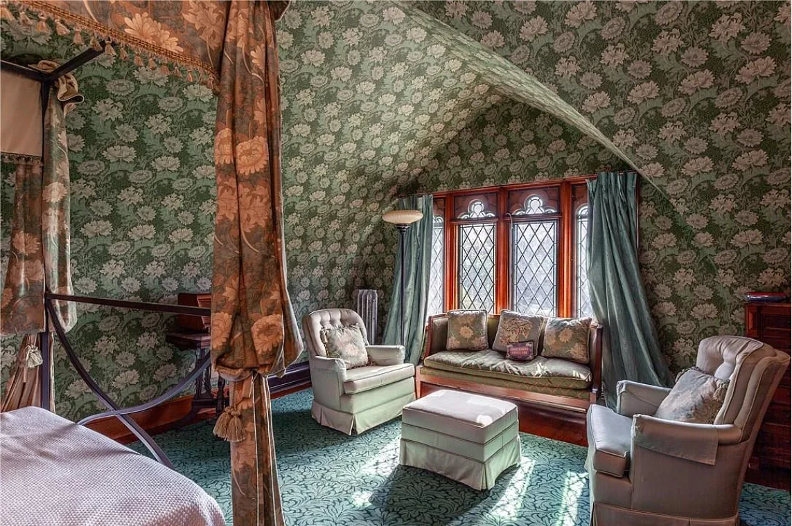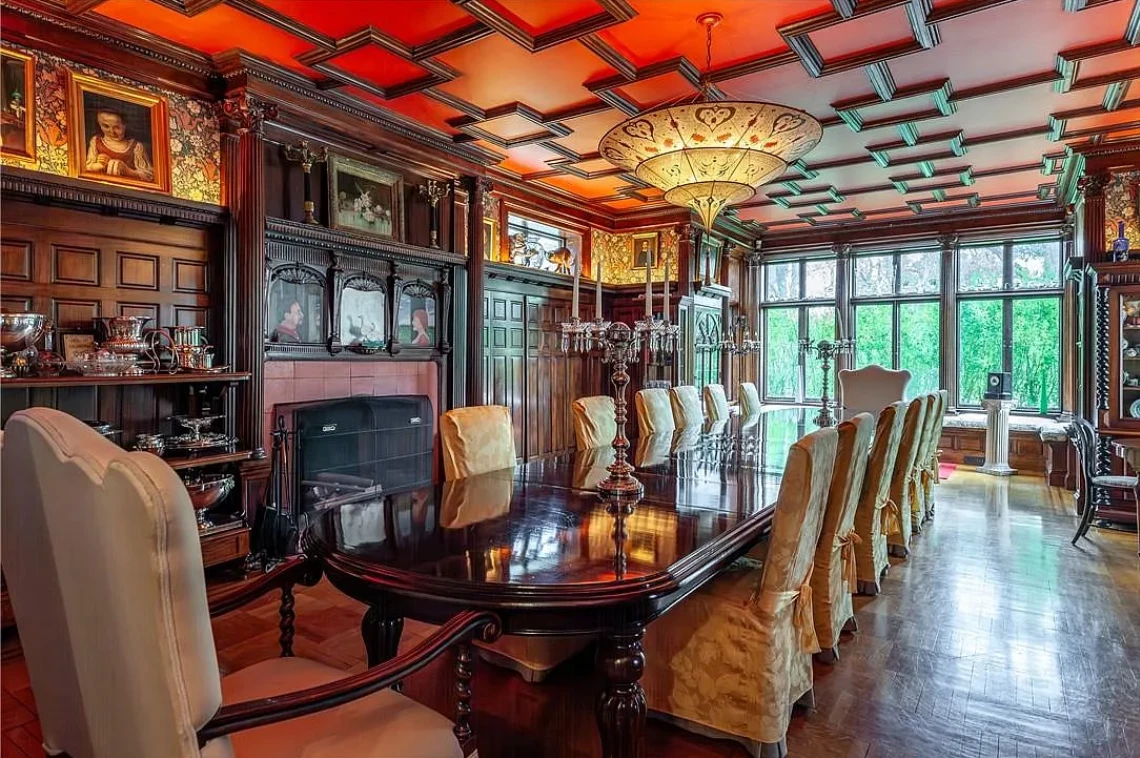 This stately residence boasts 17 beds and 13 baths, and is rich with exquisite, hand-carved details like pilasters, plaster motifs, and a grand staircase featuring whimsical animal carvings.