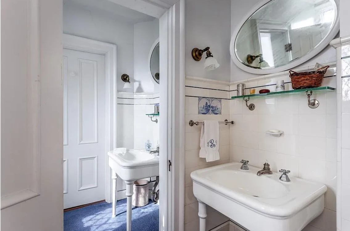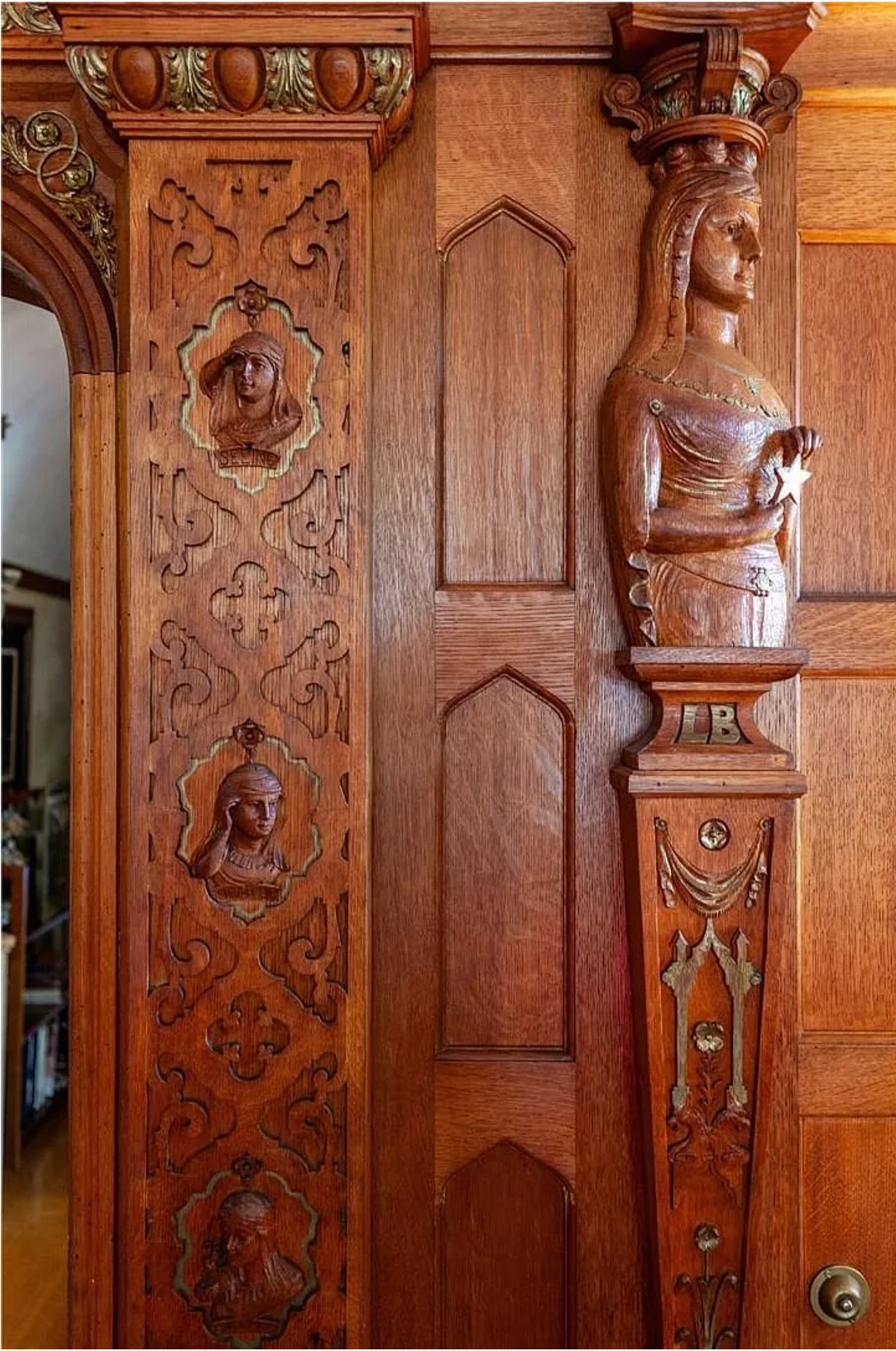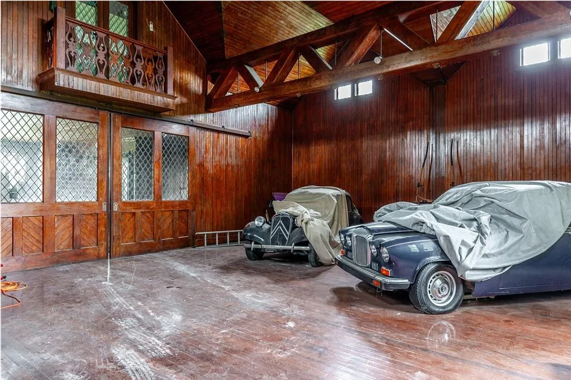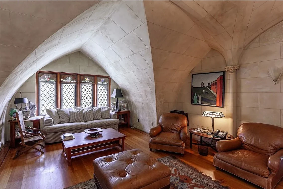 This stately residence boasts 17 beds and 13 baths, and is rich with exquisite, hand-carved details like pilasters, plaster motifs, and a grand staircase featuring whimsical animal carvings.