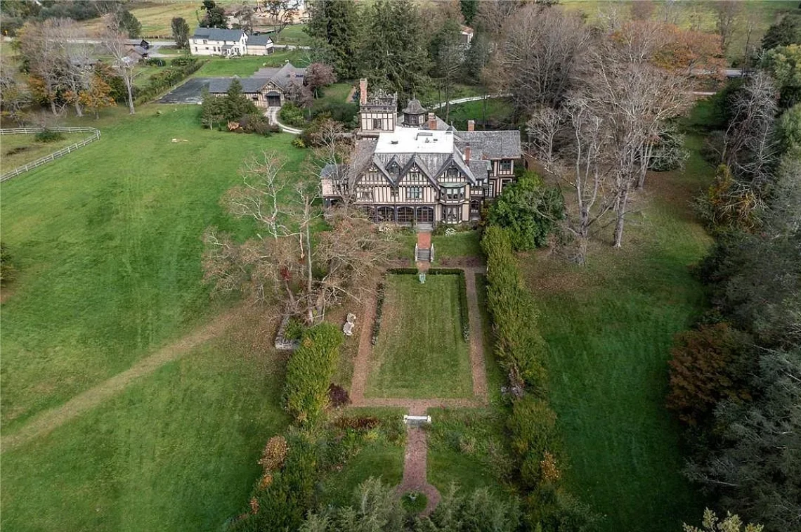 An unparalleled opportunity! Elmwood Farm is a magnificent 25.5-acre equestrian estate crowned by a 15,000 sq. ft., 43-room Elizabethan Style manor house (c. 1860) atop Quaker Hill.
