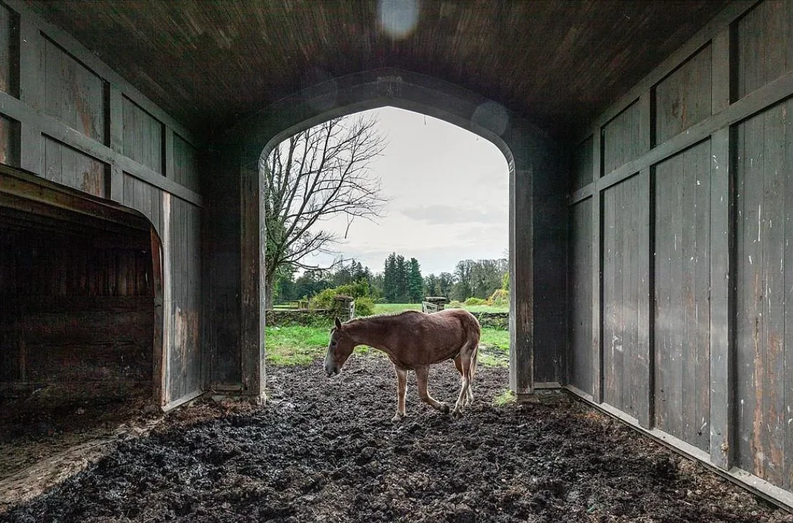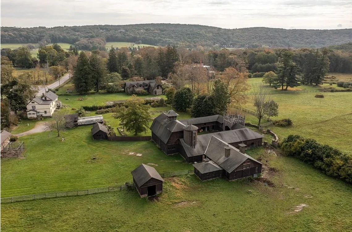 The estate is a fully equipped sanctuary for horses and guests, featuring a 12,000 sq. ft. stable, two caretaker homes, a carriage house, a yoga studio, and a greenhouse.