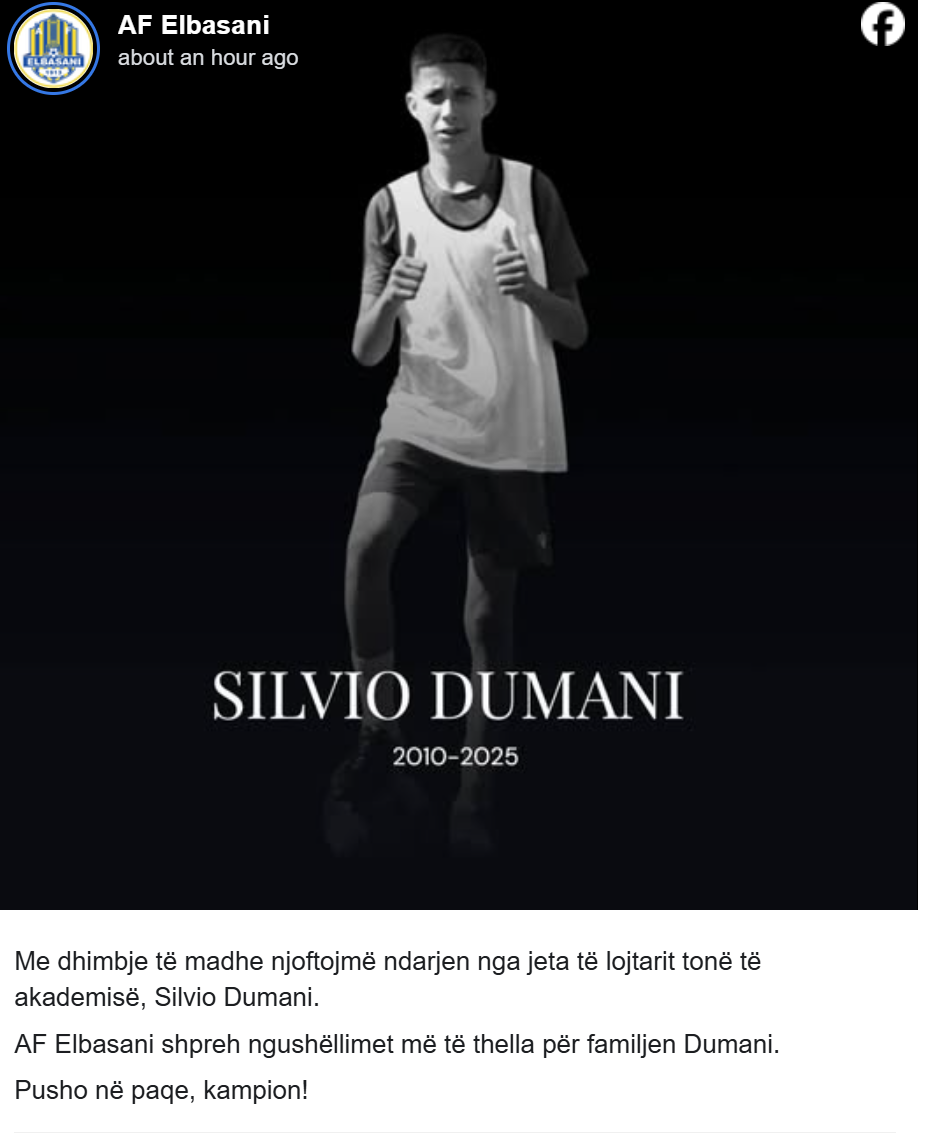 “Me dhimbje të madhe njoftojmë ndarjen nga jeta të lojtarit tonë të akademisë, Silvio Dumani. AF Elbasani shpreh ngushëllimet më të thella për familjen Dumani. Pusho në paqe, kampion!”.