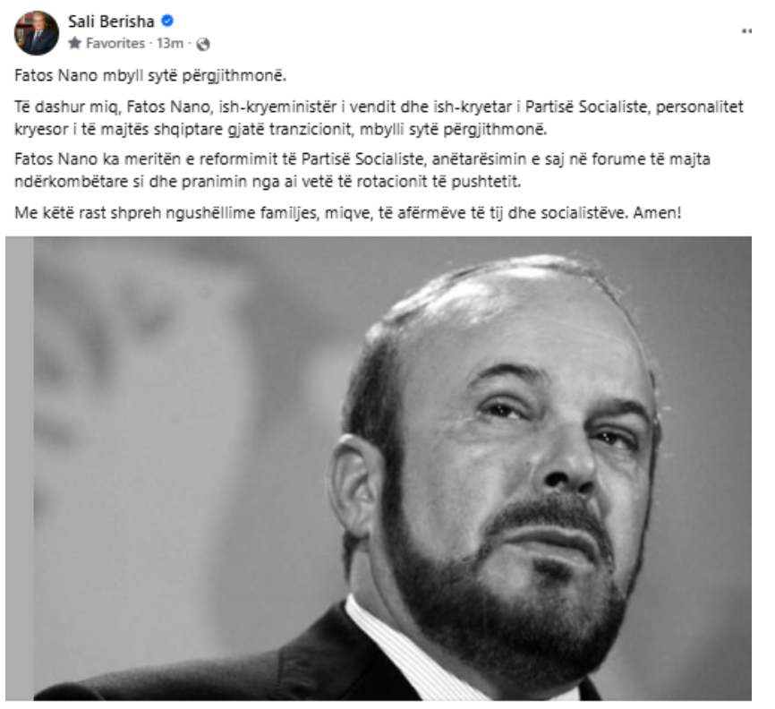 Kreu i Partisë Demokratike, Sali Berisha, ka reaguar me një status në Facebook pas ndarjes nga jeta të Fatos Nanos ditën e sotme.