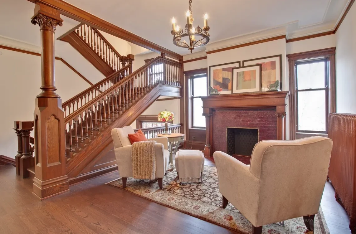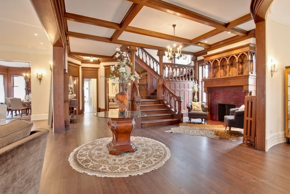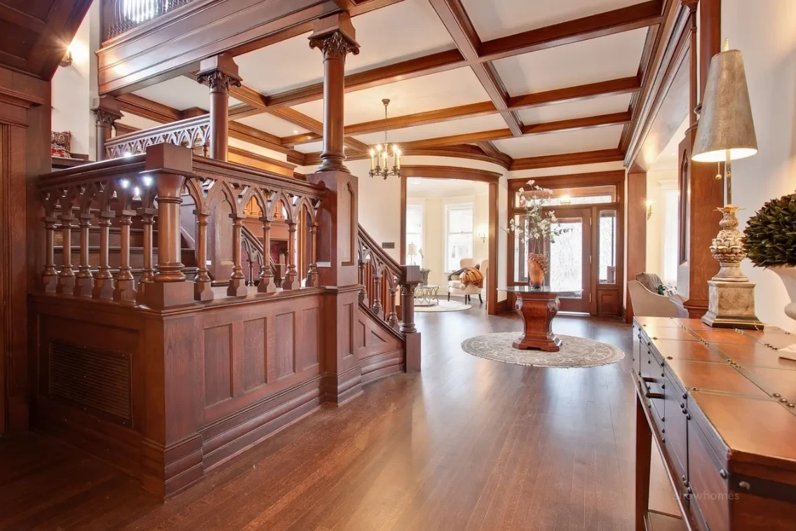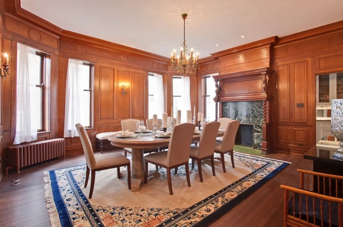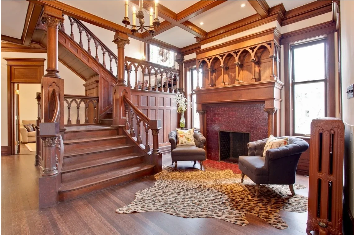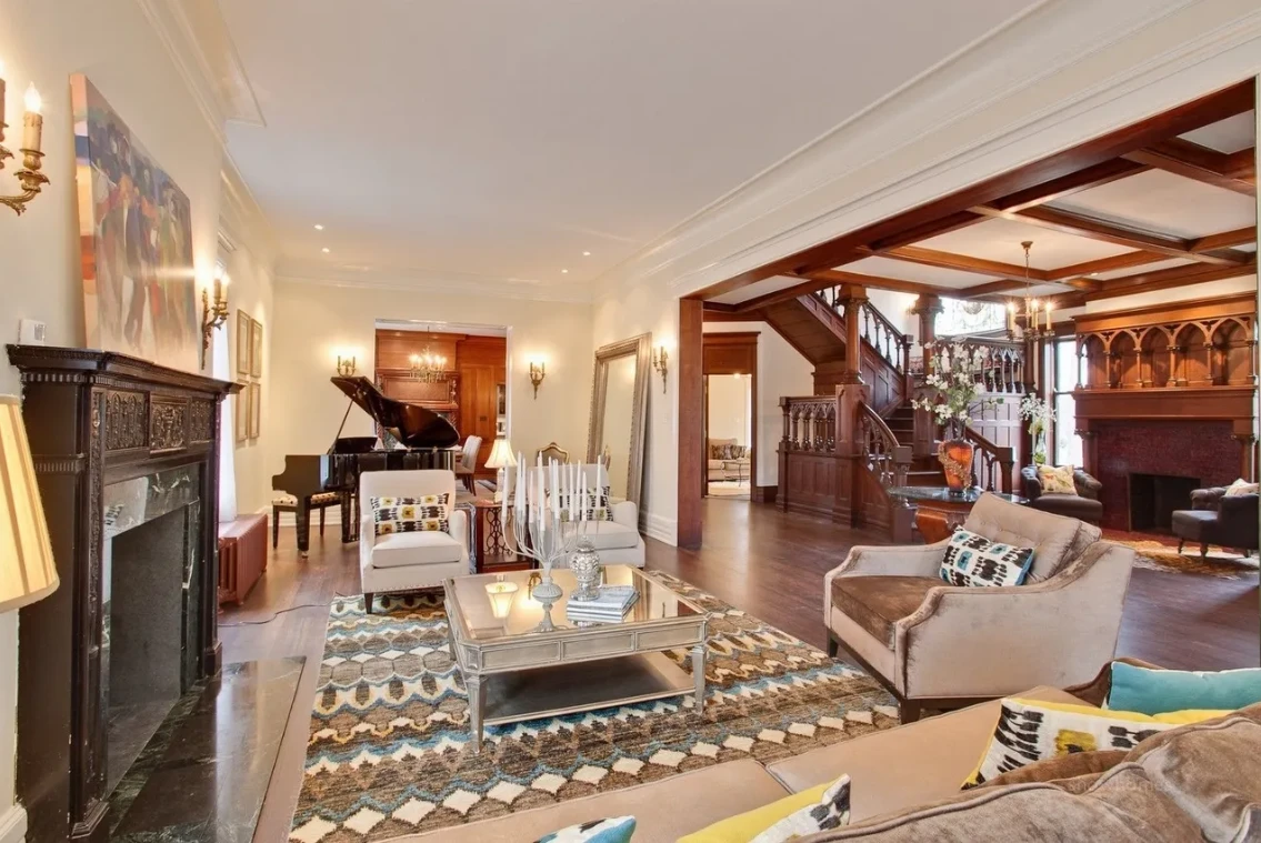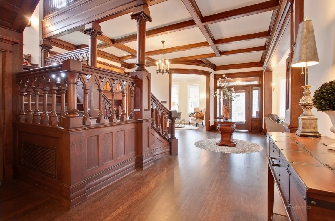 Inside, the mansion reflects the opulence of the Gilded Age: expansive formal rooms, high ceilings, detailed woodwork, and leaded glass windows. Original features such as hand-carved staircases, ornate fireplaces, and decorative plaster moldings have been carefully preserved, maintaining the home’s historic character while blending seamlessly with later restorations.