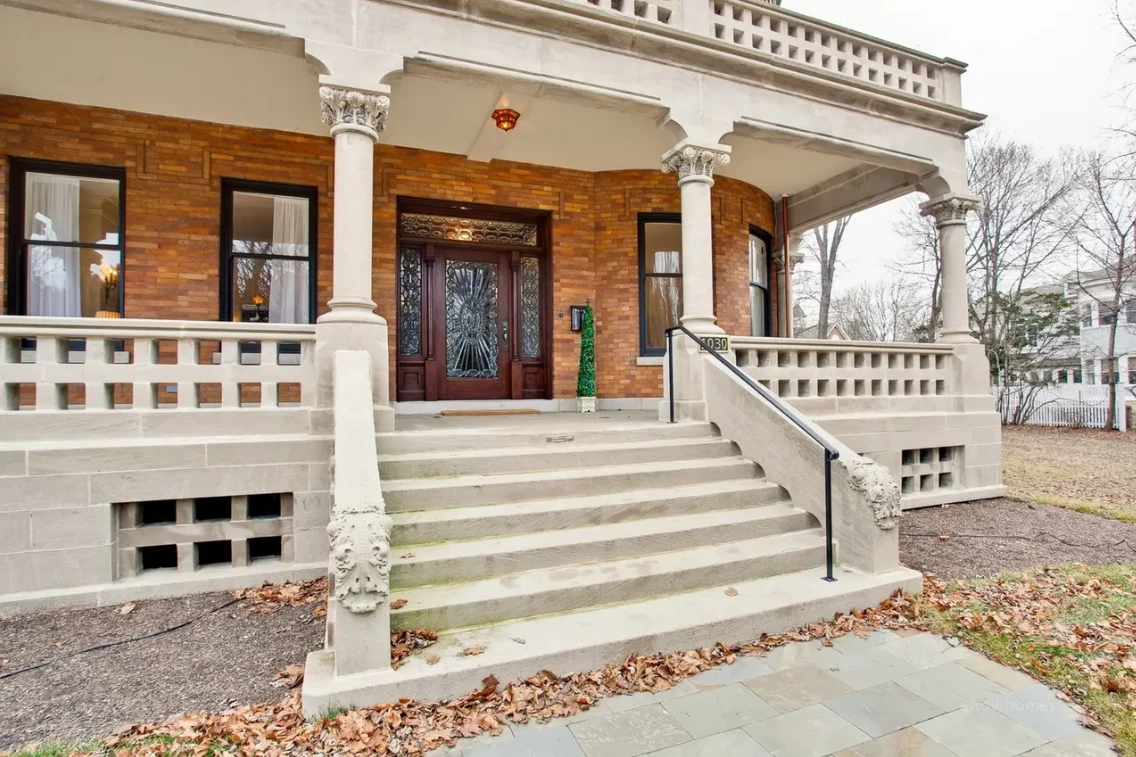 Designed by the prominent architect Dwight H. Perkins, a member of the Prairie School movement and a contemporary of Frank Lloyd Wright, the Oscar Mayer Mansion embodies both classical and early modern influences. The 7,400-square-foot estate, located at 1030 Forest Avenue, showcases elegant Georgian and Colonial Revival styles, featuring a stately red brick façade, grand columns, and intricate stone detailing.