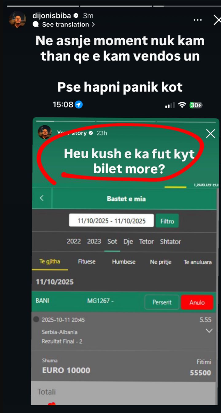 Pas publikimit të një bilete basti prej 10 mijë eurosh për ndeshjen Serbi–Shqipëri, në rrjetet sociale qarkulluan lajme se Dijonis Biba ishte arrestuar në lidhje me këtë rast.